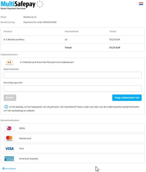 | 3. Je wordt nu doorgelinkt naar de website van Multisafepay. Hier selecteer je de optie “Cadeaukaarten”. Je ziet dan dit invulveld verschijnen. Bij “Kaartnummer” vul je de 19- cijferige code in die onder de barcode op de cadeaukaart staat. Bij “Beveiligingscode” vul je de PIN in. Hiervoor dien je het stickertje op de BBQbon te verwijderen. | ![]() |